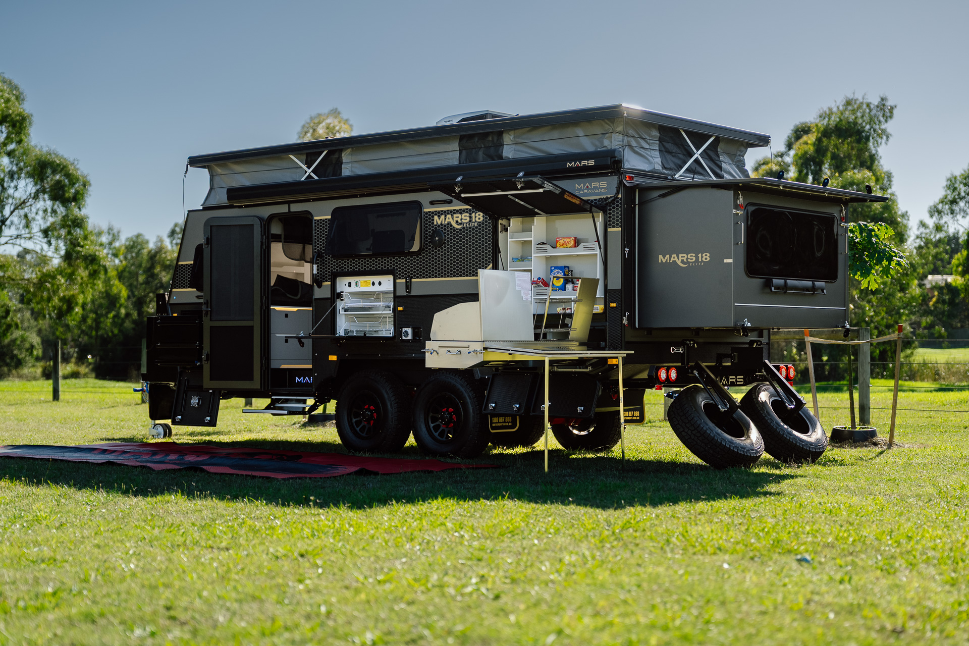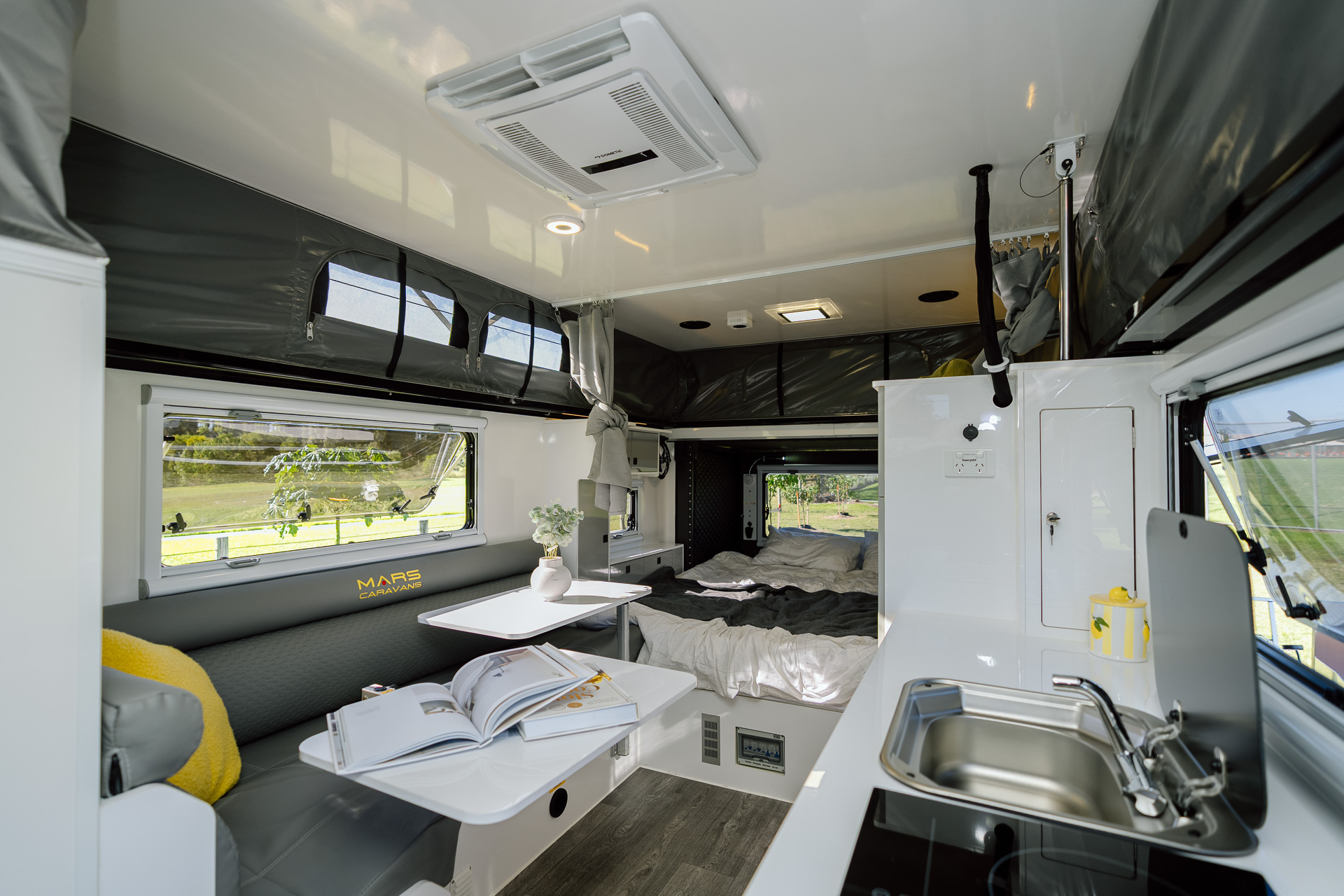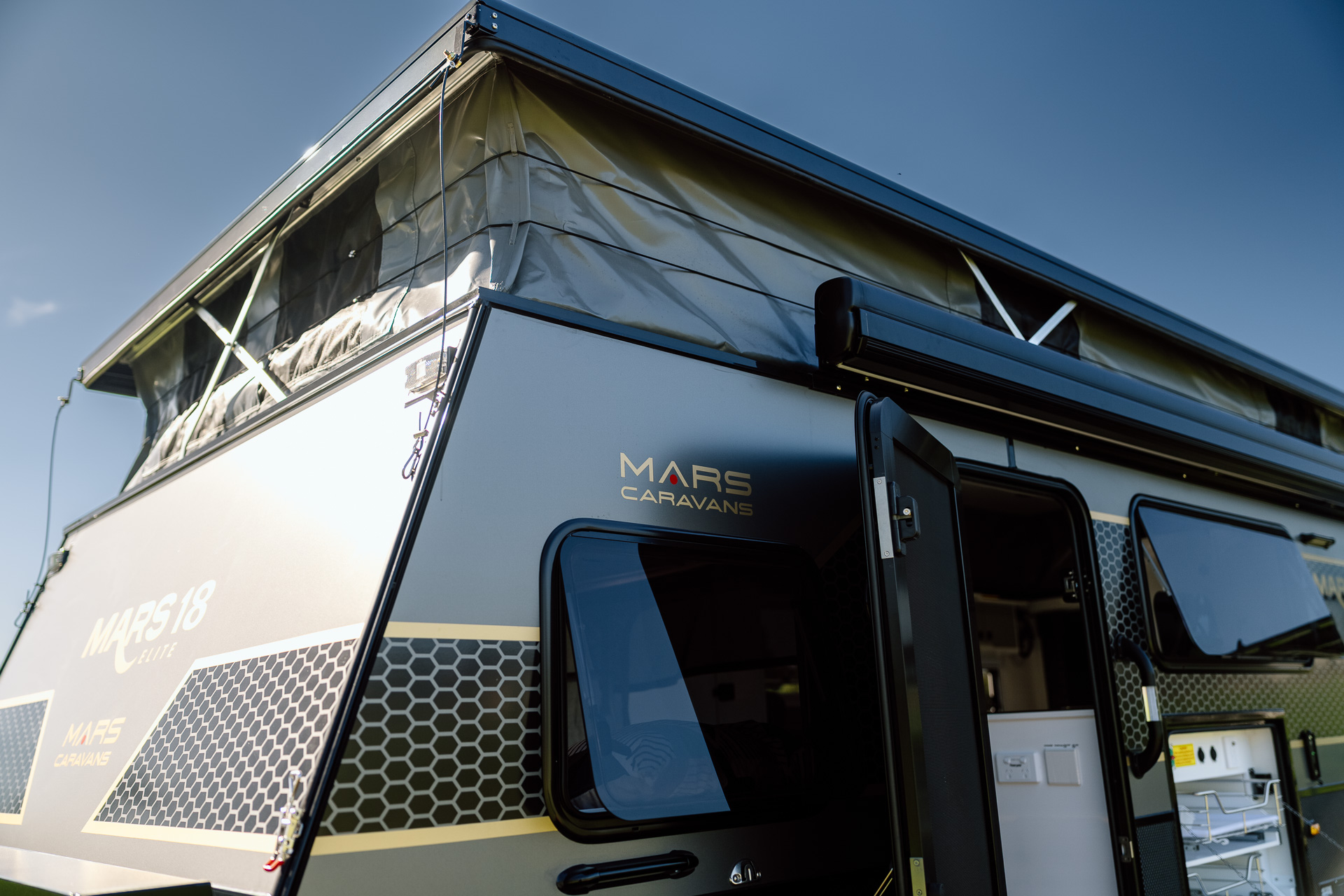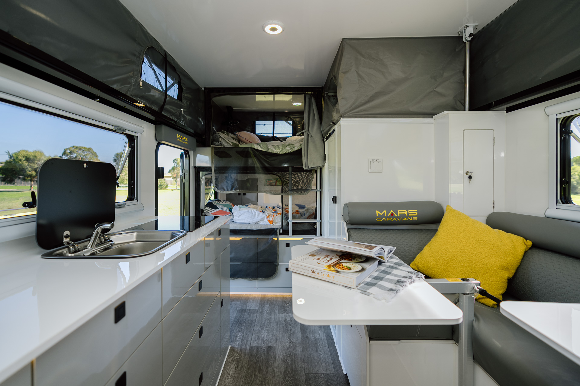 Introducing the all-new Mars 18 Elite MK III , the ultimate family adventure companion. Designed for families, this luxurious open-plan layout hybrid caravan maximises space and comfort to cater for your family’s every need. This MKIII model also features an innovative bunk bed setup, spacious interior and several other family-friendly features. With new privacy screens, Insulated Canvas walls, 600Ah Semi Solid Cell Batteries to power your reverse cycle air-conditioner and a upgraded 1020W of solar power, this easy-to-tow bunk bed family caravan is the perfect choice for families seeking adventures and experiences in the open outback.