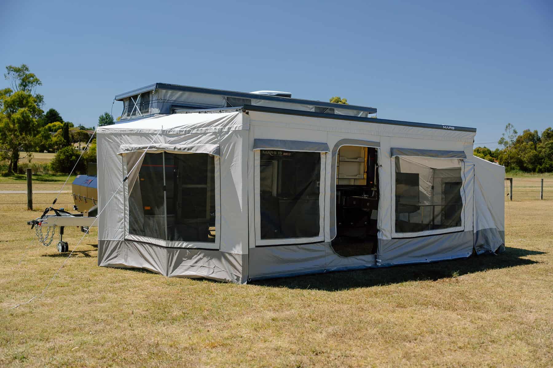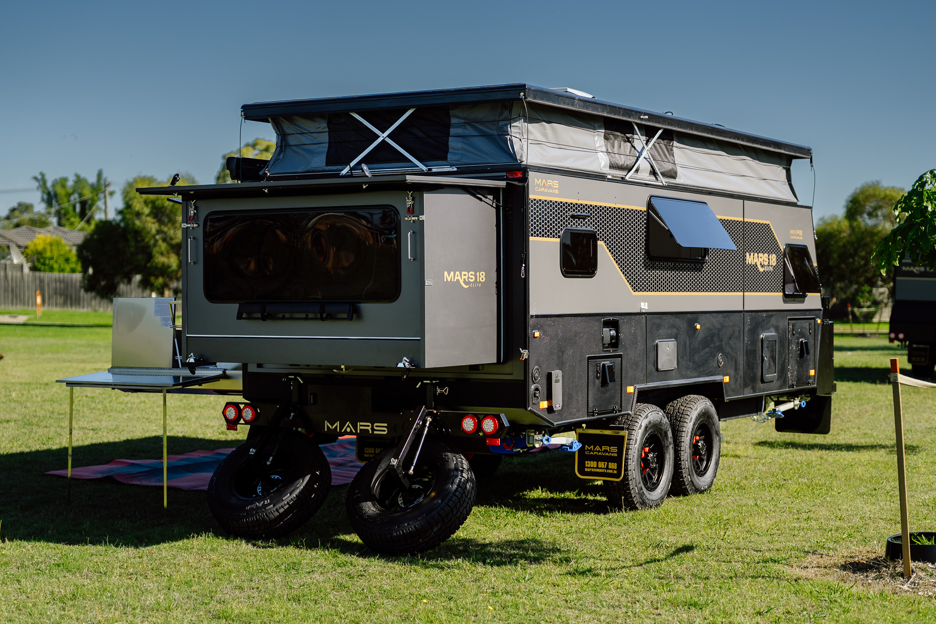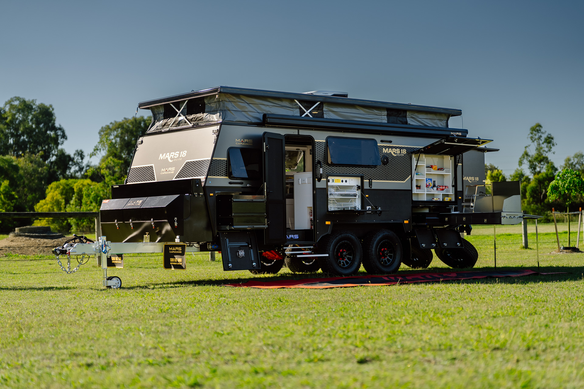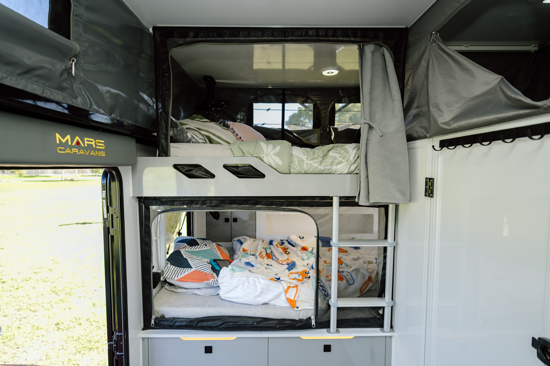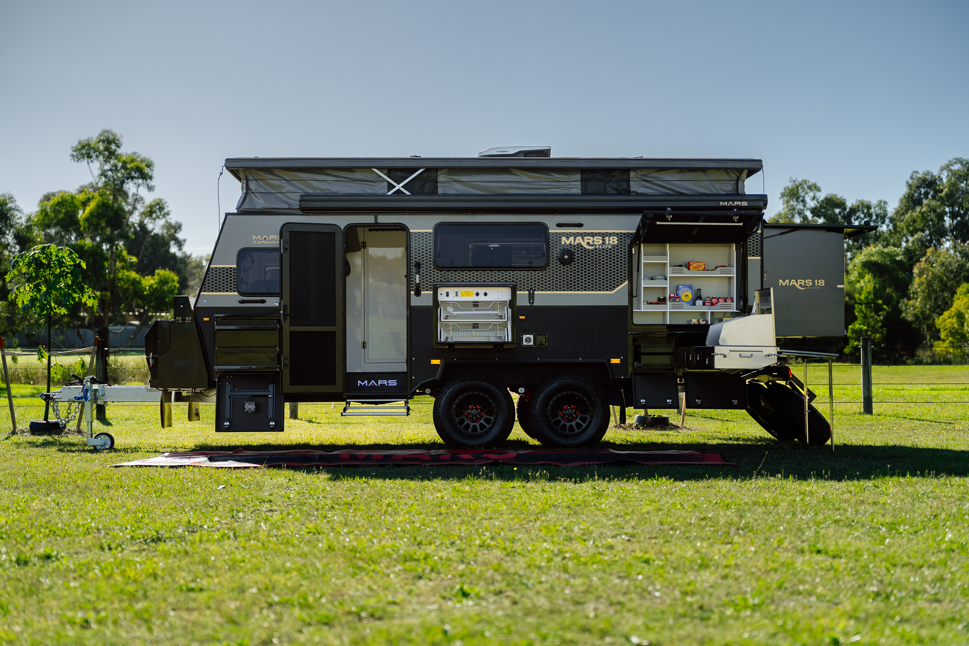 Introducing the all-new Mars 18 Elite MK III , the ultimate family adventure companion. Designed for families, this luxurious open-plan layout hybrid caravan maximises space and comfort to cater for your family’s every need. This MKIII model also features an innovative bunk bed setup, spacious interior and several other family-friendly features. With new privacy screens, Insulated Canvas walls, 600Ah Semi Solid Cell Batteries to power your reverse cycle air-conditioner and a upgraded 1020W of solar power, this easy-to-tow bunk bed family caravan is the perfect choice for families seeking adventures and experiences in the open outback.